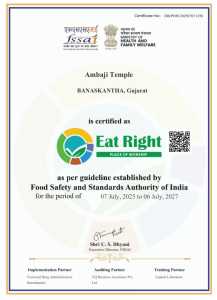 દાંતા: યાત્રાધામ અંબાજી વિશ્વભરના શક્તિ ઉપાસકોની આસ્થાનું કેન્દ્ર છે. અંબાજી મંદિર ટ્રસ્ટ દ્વારા મોહનથાળ પ્રસાદ બનાવી વેચાણ કરવામાં આવે છે. વર્ષ દરમ્યાન લગભગ એક કરોડ પચ્ચીસ લાખ જેટલા મોહનથાળ પ્રસાદનું વેચાણ કરવામાં આવે છે. મંદિર ટ્રસ્ટ દ્વારા ભાવિકોને આપવામાં આવતા પ્રસાદની ગુણવત્તા અને સ્વચ્છતાને ધ્યાને રાખતા ફૂડ સેફ્ટી એન્ડ સ્ટાન્ડર્ડસ ઓથોરિટી ઓફ ઇન્ડિયા (FSSAI) દ્વારા તમામ માપદંડોને આધારે અંબાજી મંદિરને “ઈટ રાઈટ પ્રસાદ” પ્રમાણપત્ર એનાયત કરવામાં આવ્યું છે.આ સિદ્ધિ મંદિર ટ્રસ્ટ દ્વારા ભાવિકોને આપવામાં આવતા પ્રસાદની ગુણવત્તા અને સ્વચ્છતા તથા મંદિરના ખાદ્ય વ્યવસ્થાપન અને શિસ્તબદ્ધ કામગીરીનું પ્રતિબિંબ છે. ખાસ કરીને આ સફળતા શ્રી આરાસુરી અંબાજી માતા દેવસ્થાન ટ્રસ્ટ અંબાજીના વહીવટદાર અને અધિક કલેકટર કૌશિક મોદીના માર્ગદર્શન અને નેતૃત્વ હેઠળ પ્રાપ્ત થયેલ છે.