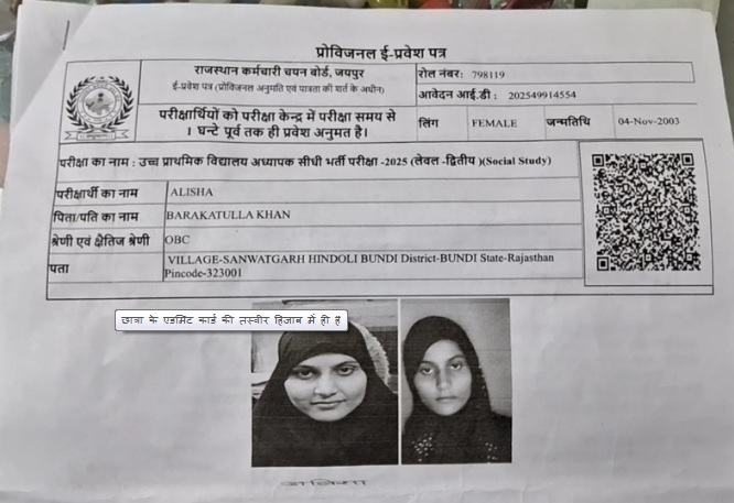 કોટાઃ રાજસ્થાનના કોટા શહેરમાં શિક્ષક ભરતી પરીક્ષા (REET Mains 2025)માં એક પરીક્ષા કેન્દ્ર પર હિજાબને કારણે એક ઉમેદવારને રોકી દેવાનો મામલો સામે આવ્યો છે. અલીશા નામની વિદ્યાર્થિનીને કોટાના એક પરીક્ષા કેન્દ્ર પર હિજાબ પહેરીને પરીક્ષા આપવા દેવામાં આવી નહોતી. ત્યાર બાદ વિદ્યાર્થિનીનો એક વિડિયો સોશિયલ મિડિયા પર વાયરલ થયો, જેમાં આરોપ લગાવવામાં આવ્યો કે પરીક્ષાની માર્ગદર્શિકામાં હિજાબ પર ક્યાંય પ્રતિબંધ નથી, છતાં પણ તેને રોકીને ભેદભાવ કરવામાં આવ્યો. જોકે પ્રશાસને આ મામલે સ્પષ્ટતા કરી છે અને જણાવ્યું છે કે વિદ્યાર્થિનીને નિયમો મુજબ જ રોકવામાં આવી હતી.