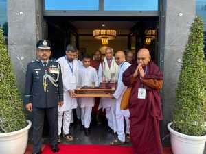 આ અવશેષો હાલમાં વડોદરાની મહારાજા સયાજીરાવ યુનિવર્સિટીમાં સુરક્ષિત રાખવામાં આવ્યા છે. તેમને ભારતીય વાયુસેનાના વિશેષ વિમાન દ્વારા પૂર્ણ રાજકિય સન્માન સાથે કોલંબો લઈ જવામાં આવ્યા છે. ગુજરાતના રાજ્યપાલ આચાર્ય દેવવ્રત અને નાયબ મુખ્યમંત્રી હર્ષ સંઘવીના નેતૃત્વમાં ઉચ્ચસ્તરીય ભારતીય પ્રતિનિધિમંડળ તેમની સાથે જોડાયું છે. જેમાં વરિષ્ઠ બૌદ્ધ ભિક્ષુઓ અને અધિકારીઓ પણ જોડાયા છે.