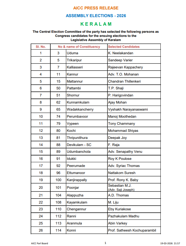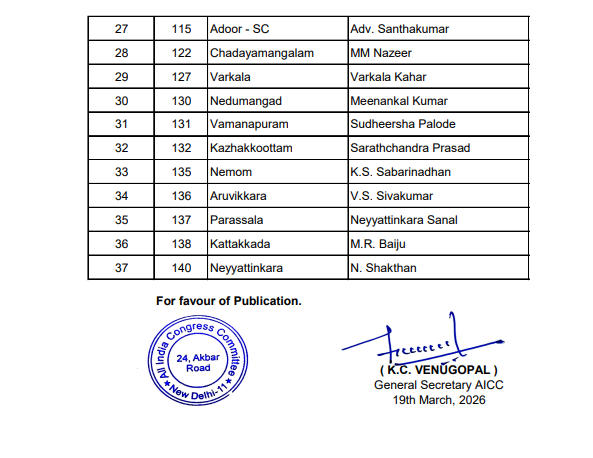 કેરળ વિધાનસભા ચૂંટણી ૨૦૨૬ના જંગમાં જીત મેળવવા માટે કોંગ્રેસ પોતાની રણનીતિ તેજ કરી દીધી છે. લાંબા સમયથી ચાલી રહેલા મડાગાંઠ અને આંતરિક ખેંચતાણ બાદ આખરે ગુરુવારે મોડી રાત્રે કોંગ્રેસ હાઈકમાન્ડે 37 ઉમેદવારોની બીજી યાદીને મંજૂરી આપી દીધી છે. અગાઉ પ્રથમ તબક્કામાં પક્ષે ૫૫ નામોની જાહેરાત કરી હતી, અને હવે આ બીજી યાદી સાથે કોંગ્રેસે રાજ્યના મહત્વના મતક્ષેત્રોમાં પોતાના મજબૂત ચહેરાઓ મેદાનમાં ઉતાર્યા છે. ખાસ કરીને કન્નૂર બેઠક પર સાંસદ કે. સુધાકરન દ્વારા ટિકિટની વહેંચણીને લઈને ઉઠાવવામાં આવેલા વિરોધ બાદ પક્ષમાં જે હલચલ મચી હતી, તેનો અંત આવતા નેતાઓએ રાહતનો શ્વાસ લીધો છે.