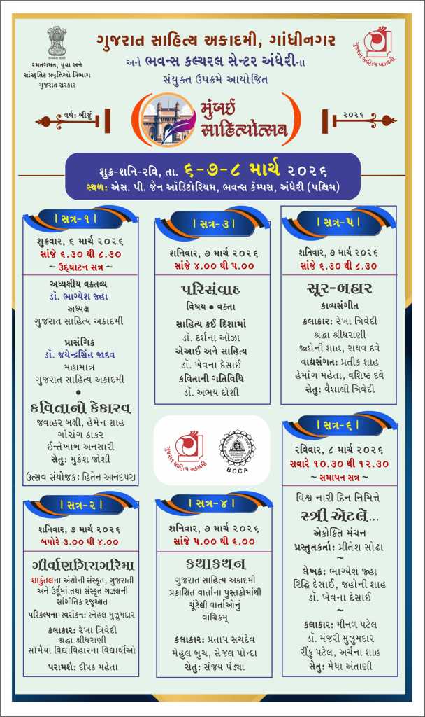 આ વર્ષે `મુંબઈ સાહિત્યોત્સવ’નું આયોજન કરવામાં આવ્યું છે. જે કાર્યક્રમનો ગત વર્ષે શુભારંભ થયો હતો. ભવન્સ કલ્ચરલ સેન્ટર અંધેરીના સંયુક્ત ઉપક્રમે આગામી 6થી 8 માર્ચ સુધી એસ.પી. જૈન સભાગૃહ, ભવન્સ કૅમ્પસ, અંધેરી (વેસ્ટ), મુંબઈ ખાતે ત્રિદિવસીય સાહિત્યોત્સવ યોજાશે. આ કાર્યક્રમમાં કુલ છ સત્રમાં 35થી વધુ સર્જક, વક્તા અને કલાકાર સહભાગી થશે.