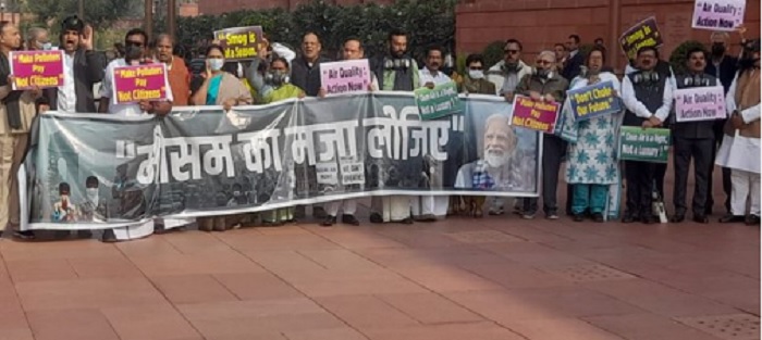 નવી દિલ્હીઃ દિલ્હીના પ્રદૂષણ મુદ્દો ગંભીર થ ગયો છે. ગુરુવાર સવારે સંસદ પરિસરમાં વિરોધ પક્ષના સાંસદો મકર દ્વારે પહોંચી પ્રદૂષણ સામે પોતાનો વિરોધ નોંધાવ્યો હતો. વિરોધ પક્ષના કેટલાક સાંસદોએ પોતાના ચહેરા પર માસ્ક પહેર્યા હતા અને પ્રદૂષણવિરોધી સૂત્રો લખેલાં પ્લેકાર્ડ અને બેનર હાથમાં રાખ્યાં હતા. કોંગ્રેસાધ્યક્ષ મલ્લિકાર્જુન ખડગે અને કોંગ્રેસ સંસદીય દળની અધ્યક્ષા સોનિયા ગાંધીના નેતૃત્વમાં આ વિરોધ પ્રદર્શન થયું હતું. એક બેનર પર વડા પ્રધાન નરેન્દ્ર મોદીની તસવીર સાથે ‘मौसम का मजा लीजिए’ લખ્યું હતું.