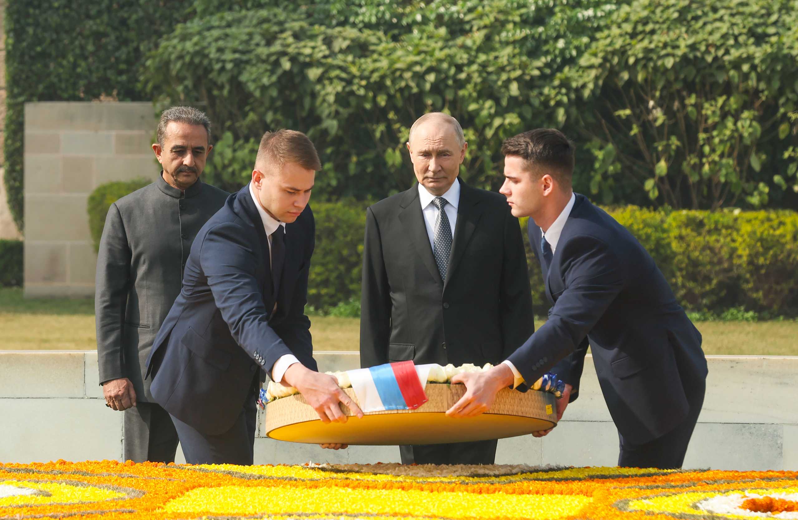 રાજઘાટ જવા પહેલાં રાષ્ટ્રપતિ ભવનમાં રાષ્ટ્રપતિ દ્રૌપદી મુર્મુ અને વડા પ્રધાન નરેન્દ્ર મોદીએ તેમનું સ્વાગત કર્યું હતું. ત્યાર બાદ પુતિનને ભારતની ત્રણેય સેનાઓએ ગાર્ડ ઓફ ઓનર આપ્યો. પુતિનને તોપોની સલામી પણ આપવામાં આવી. બન્ને રાષ્ટ્રપ્રમુખો — દ્રૌપદી મુર્મુ અને પુતિને એકબીજાના પ્રતિનિધિમંડળો સાથે મુલાકાત કરી હતી.