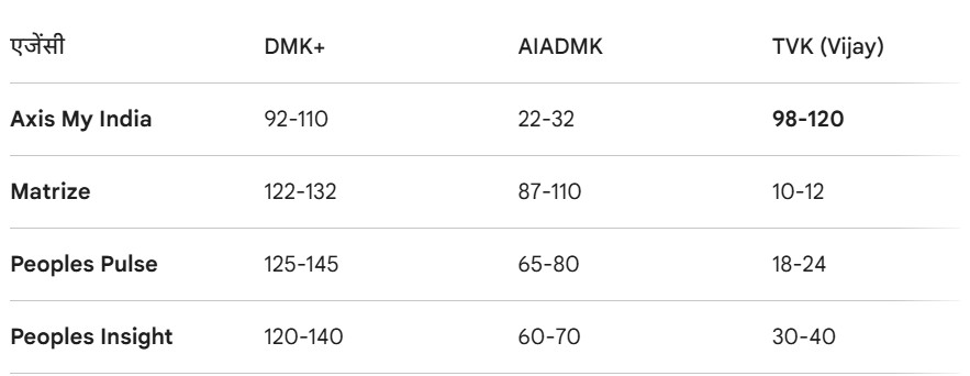 તમિલનાડુ વિધાનસભા ચૂંટણી ૨૦૨૬ ના એક્ઝિટ પોલના આંકડા મુજબ અભિનેતા વિજયની પાર્ટી TVK ૯૮ થી ૧૨૦ બેઠકો જીતી શકે છે. એક્સિસ માય ઈન્ડિયાના સર્વે મુજબ ૩૫% વોટ શેર સાથે TVK સૌથી મોટા પક્ષ તરીકે ઉભરી શકે છે, જે સીએમ એમ.કે. સ્ટાલિનની DMK માટે મોટો ઝટકો સાબિત થઈ શકે છે. રાજ્યની કુલ ૨૩૪ બેઠકો પર બહુમતી માટે ૧૧૮ બેઠકોની જરૂર છે, ત્યારે વિજયની પાર્ટી સરકાર બનાવવાની સ્થિતિમાં હોવાનું જણાય છે. જોકે, અન્ય કેટલાક પોલ્સમાં DMK ને પણ મજબૂત બતાવવામાં આવી છે.