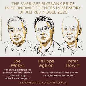 રોયલ સ્વીડિશ એકેડેમી ઓફ સાયન્સિસે આર્થિક વિજ્ઞાનના 2025ના નોબેલ પુરસ્કારની જાહેરાત કરી. આલ્ફ્રેડ નોબેલની યાદમાં અપાતા આ સ્વેરિજેસ રિક્સબેંક પુરસ્કાર માટે જોએલ મોકિર, ફિલિપ એગિયન અને પીટર હોવિટના નામની જાહેરાત કરવામાં આવી છે. આ પુરસ્કાર તેમને “નવીનતા-સંચાલિત આર્થિક વિકાસને સમજાવવા બદલ” આપવાનો નિર્ણય લેવામાં આવ્યો છે.પુરસ્કારનો અડધો ભાગ મોકિરને “ટેકનોલોજીકલ પ્રગતિ દ્વારા સતત વિકાસ માટેની પૂર્વજરૂરીયાતો ઓળખવા બદલ” અને બાકીનો અડધો ભાગ “સર્જનાત્મક વિનાશ દ્વારા સતત વિકાસના સિદ્ધાંત માટે” સંયુક્ત રીતે આપવામાં આવશે.