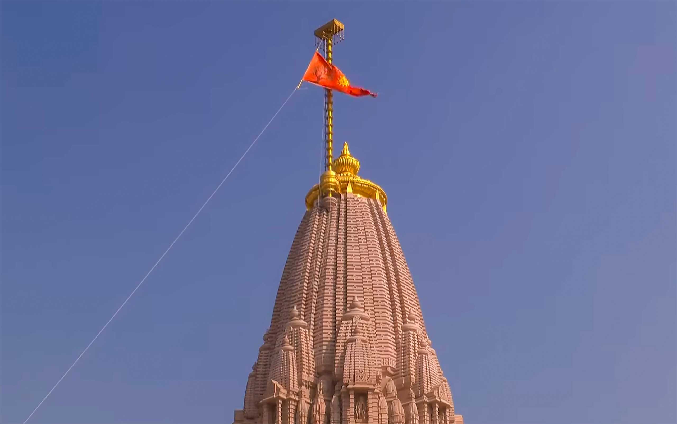 અયોધ્યાઃ અયોધ્યાને દુલ્હનની જેવી સજાવવામાં આવી છે. અયોધ્યાસ્થિત રામ મંદિરના શિખર પર PM મોદી અને RSSપ્રમુખ મોહન ભાગવતે ધ્વજ ફરકાવ્યો હતો. એ પહેલાં બંનેએ રામ મંદિરમાં રામલલાનાં દર્શન કર્યાં હતાં. આ વિશેષ ધ્વજને અમદાવાદના શિલ્પકાર ભરત મેવાડે અનેક મહિનાઓની મહેનત અને બારીકીથી તૈયાર કર્યો છે.