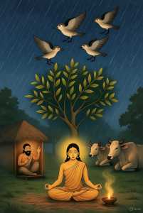 આશ્રમનાં તમામ ઝાડવાંઓ જંપી ગયાં હતાં. પંખીઓ નિદ્રાધીન હતાં. ગૌશાળાની ગાયો પણ આંખો મીંચીને જાણે સમાધિસ્થ થઈ હતી.